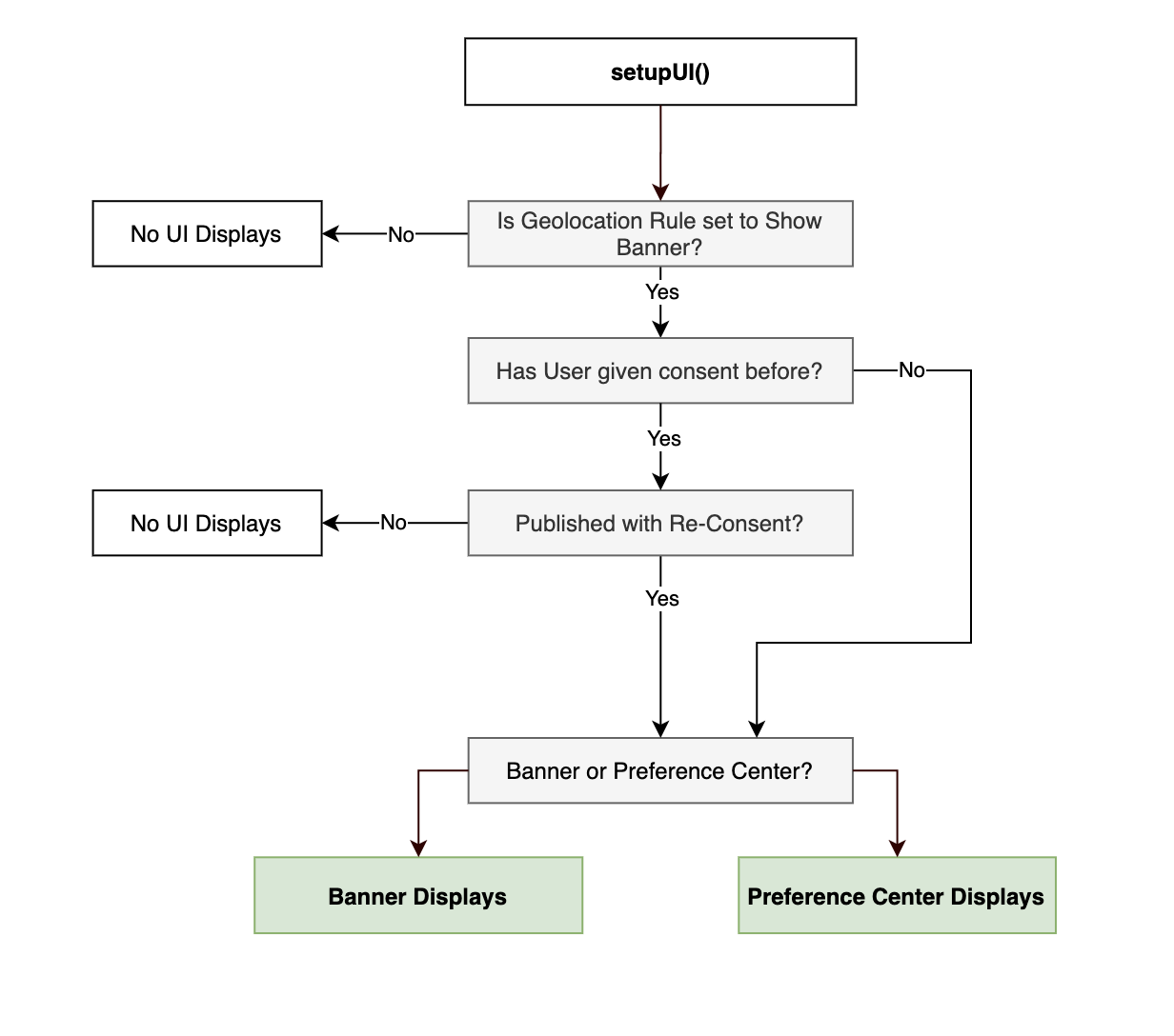 The SDK provides the capability to determine if the OneTrust Banner or Preference Center UI needs to be shown once it retrieves, parses and saves the data from the server as part of the startSDK() call.