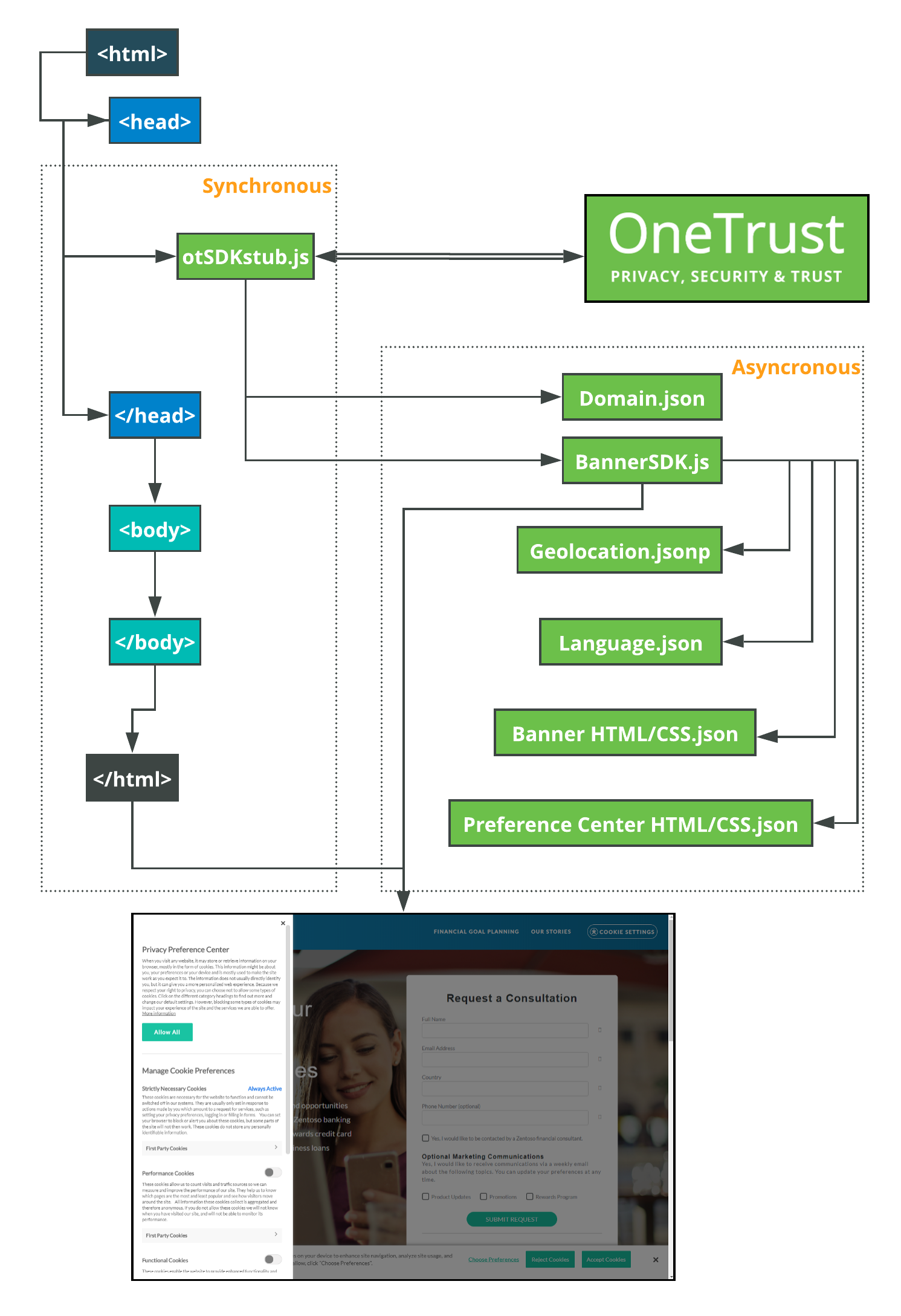Loading the Cookie Banner Script and Preference Center has been designed to minimize page load times by taking advantage of asynchronous loading. The graphic below outlines the process for loading the Banner Script and Preference Center.